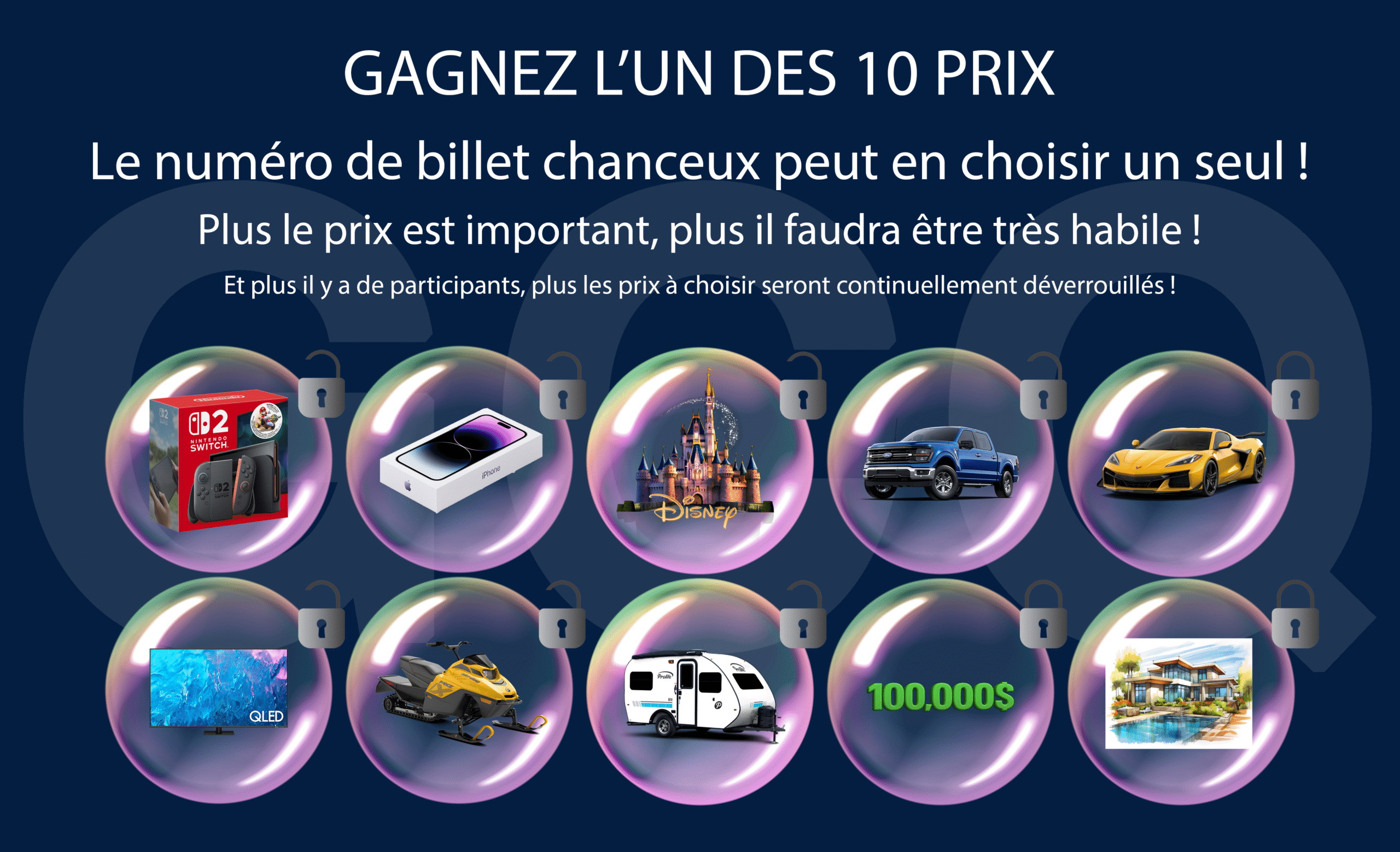 Procurez-vous dès maintenant votre numéro de participation pour l’événement de l’année! Chaque participant peut avoir plusieurs billets de participation. Si votre numéro est tiré, vous devrez réussir une épreuve d’habileté afin de remporter le prix de votre choix, lors de l’événement.